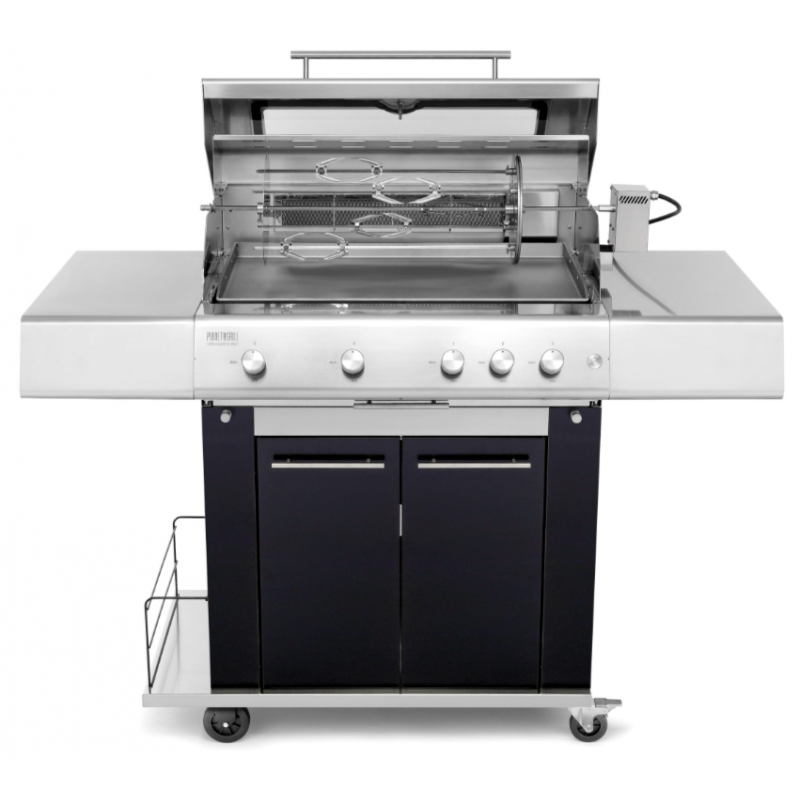 Gratar mobil PIANETAGRILL PIANETAGRILL12 NEGRU plită 750x450 mm și rafturi laterale cu frigărui motorizat încorporat