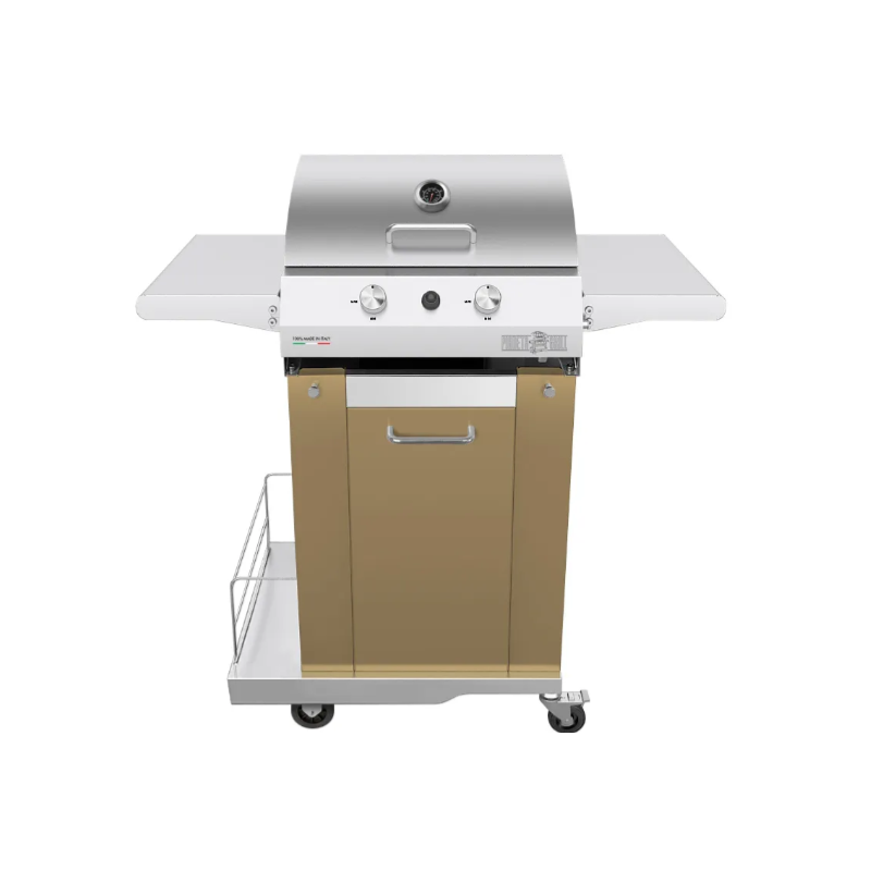 Gratar cu roti PIANETAGRILL PIANETAGRILL34 CREM două arzătoare 8kW,rafturi laterale pliabile,umerase pentru scule